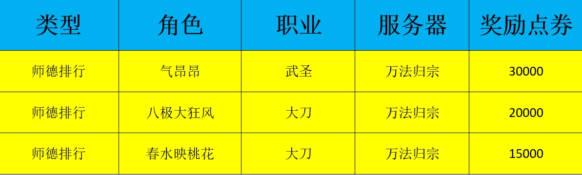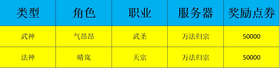 “神之对决”活动结果现也已揭晓。他们每一个人无疑是站在每个服务器中的巅峰王者,他们就是每个服务器中独一无二的“武神”、“法神”!按照活动规则,他们每个人将获得50000点券的奖励!